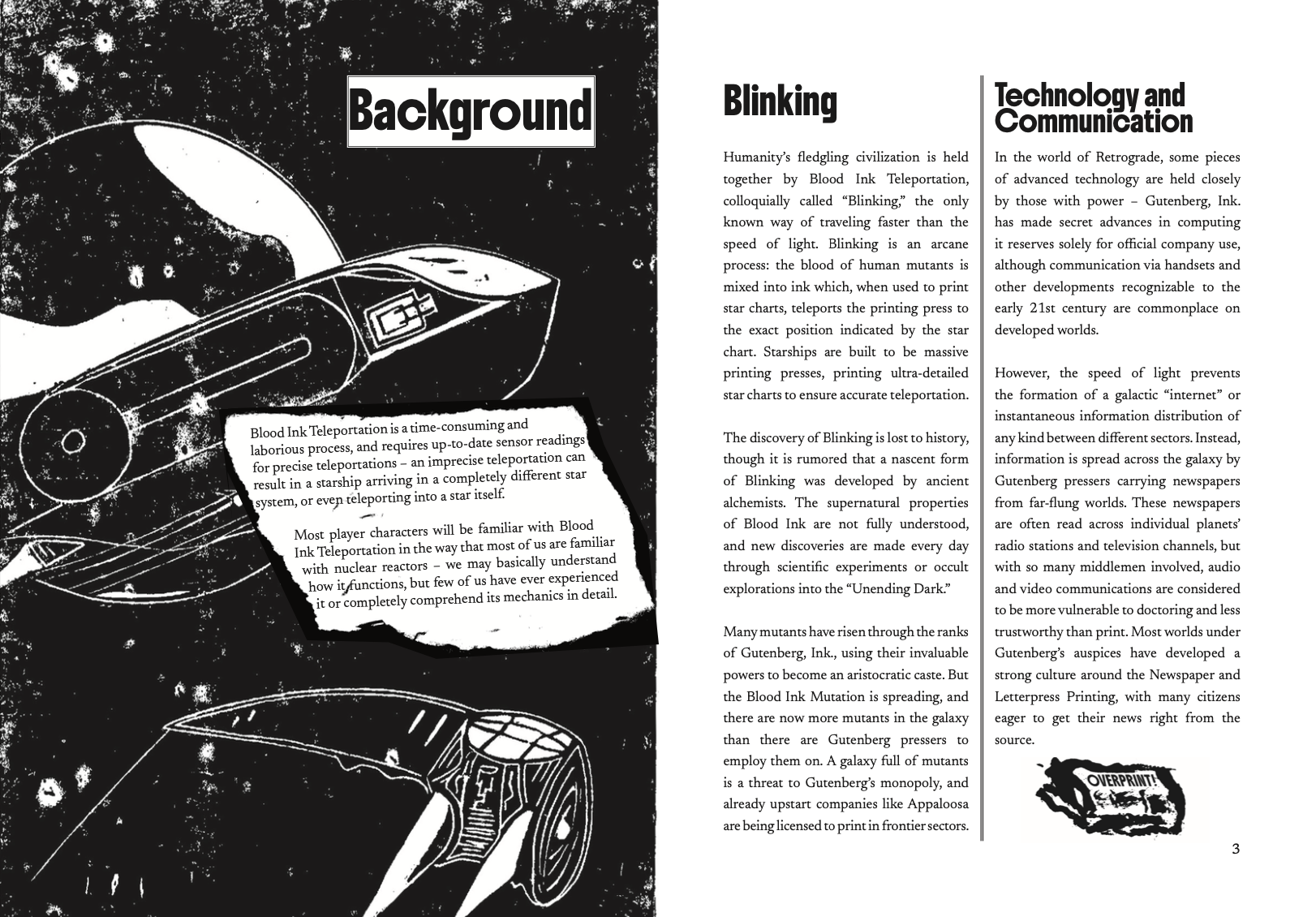 Overprint is designed for play with a Librarian and 2-4 players and can be completed in approximately 3-5 play sessions. You can find the Retrograde core rules here.